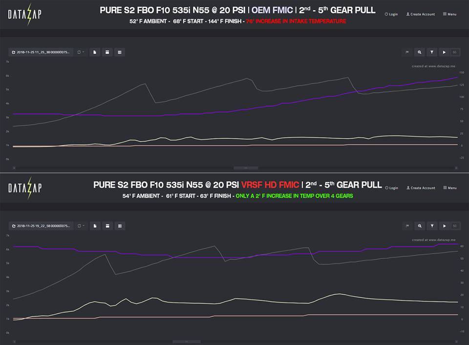 The OEM intercooler easily heat soaks and temperature rises from 80 – 90 degrees during a 2 through 5 gear pull aren’t uncommon. High intake temps are both harmful for your engine and performance. As displayed in the logs below, the VRSF offers a significant improvement in terms of intake temperature control and actually manages to keep temperatures closer to ambient through out multiple gear pulls. In the example below we show a F10 535i on a 54 degree day. The VRSF Race HD intercooler maintains a safe temperature through the entire 2nd through 5th gear pull while only rising 2 degrees whereas the OEM intercooler rose 76 degrees at the same boost levels (20 psi).