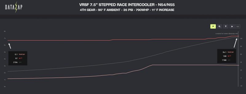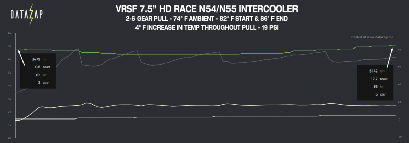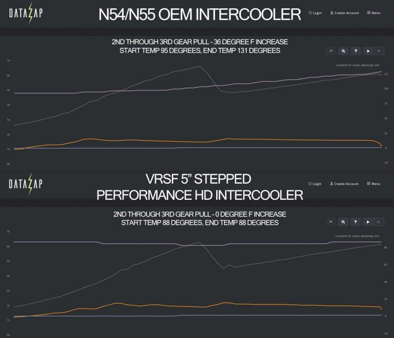 The VRSF 5″ Performance HD is the best option available for stock turbo N54 and N55’s on the market. The 5″ features a much denser fin pack both internally and externally than comparable options. The stock BMW intercooler rises about 32 degrees during a 3rd gear pull whereas it’s not uncommon to see intake temperatures stay even at the end of a 3rd gear pull with the VRSF 5″ Performance due to the larger overall surface area.